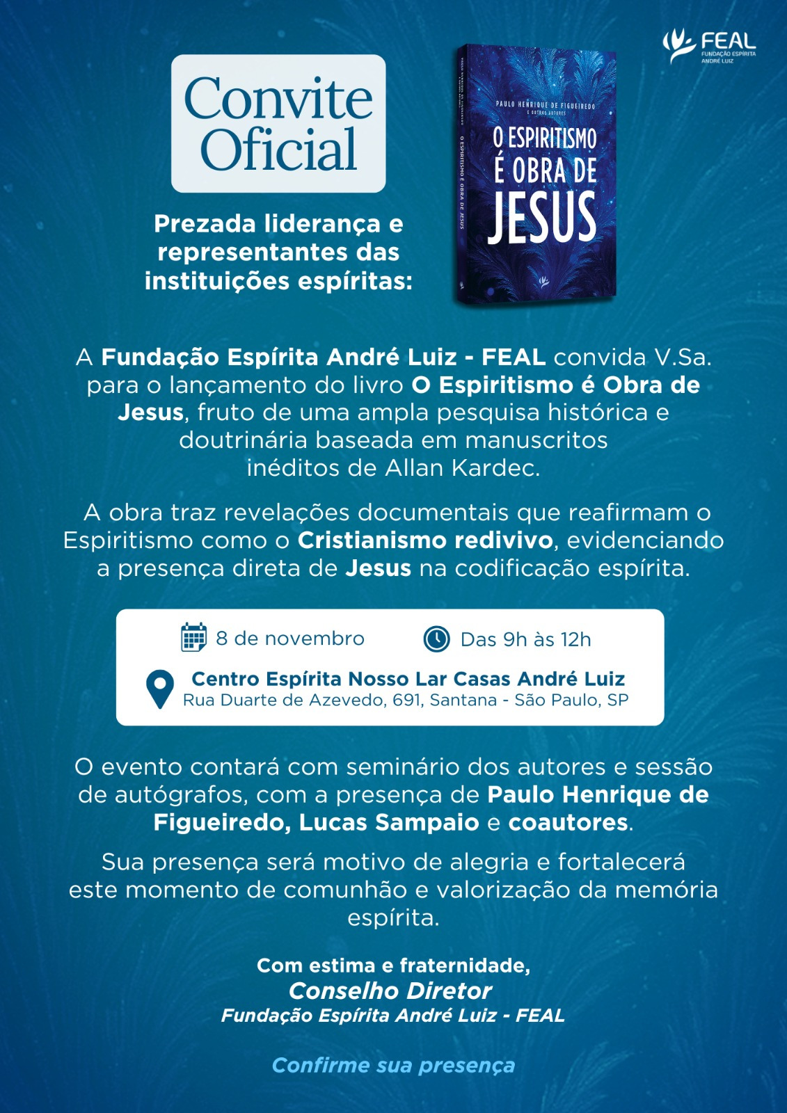 Estivemos presentes, representando o Coletivo “Espiritismo COM Kardec – ECK”, no último dia 8 de novembro, na sede da Fundação Espírita André Luiz (FEAL) – Centro Espírita Nosso Lar – Casas André Luiz, ao lançamento do livro “O Espiritismo é obra de Jesus”, de Paulo Henrique de Figueiredo, Lucas Sampaio e outros coautores. Na ocasião todos os que participaram diretamente da composição do livro foram apresentados ao público.