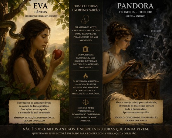 Essas narrativas não surgem isoladas, mas dentro de contextos culturais marcados por estruturas patriarcais. Ao atribuir à figura feminina a responsabilidade pela ruptura da ordem original, esses mitos acabam funcionando como justificativas simbólicas para a desconfiança em relação à mulher — vista como mais suscetível ao erro, ao desejo ou à transgressão. Com isso, constrói-se, no imaginário coletivo, a associação entre feminino e perigo moral, o que historicamente contribuiu para legitimar práticas de controle e subordinação.